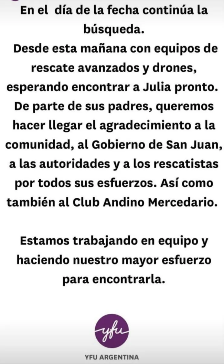 Antes de viajar, la familia de Julia dejó un mensaje a través de las redes sociales de Youth For Understanding (YFU), la organización de voluntarios e intercambios culturales con la que la joven llegó al país. "Continúa la búsqueda. Desde esta mañana, con equipos de rescate avanzados y drones, esperando encontrar a Julia pronto", comienza el comunicado publicado en una historia de Instagram.