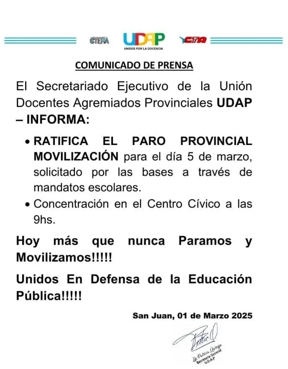Por la mañana de este sábado 1 de marzo, desde UDA confirmaron que finalmente no participarán del paro docente previsto para el miércoles 5 de marzo. Sin embargo, tanto AMET como UDAP y SADOP decidieron mantener la medida de fuerza.